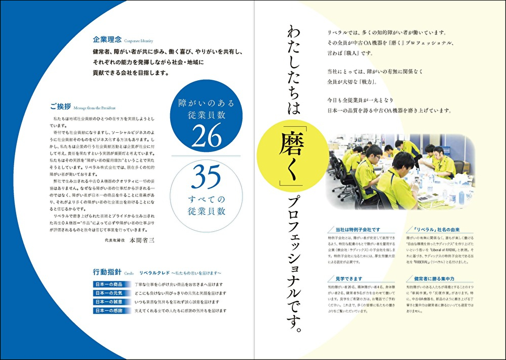 建築設備工事、リニューアル工事、保守工事を事業とする株式会社REC様の会社案内を制作しました。ページを開くギミックを活用した構成とデザインで、事業や企業理念をビジ…