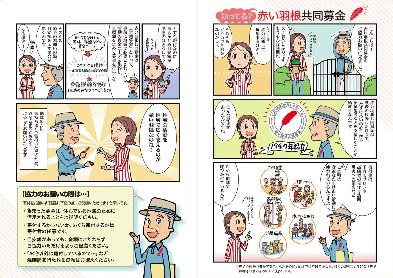 赤い羽根共同募金を周知するためのパンフレット2種を制作しました。どちらも漫画を軸に、赤い羽根共同募金の使途や仕組みをわかりやすく伝えています。