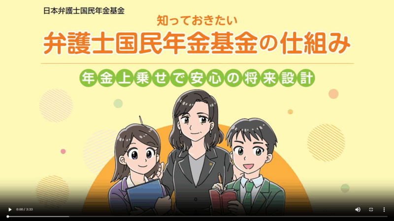 日本弁護士国民年金基金様の加入勧奨用パンフレット「知っておきたい弁護士国民年金基金の仕組み」のマンガをベースに、動画を制作しました。制度の内容を文字と声で伝えることで、弁護士国民年金基金の仕組みをさらに理解しやすくなりました。動画・パンフレットは、日本弁護士国民年金基金様のホームページよりご覧いただけます。