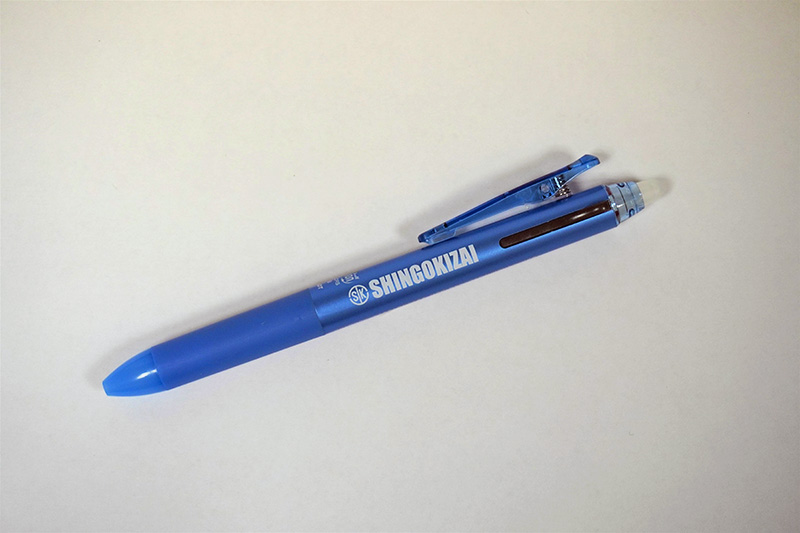 名入れボールペン クライアント信号器材株式会社様信号器材株式会社様の名入れボールペンを制作しました。 フリクションボール2(赤・黒インク)のライトブルーに、ロゴマークを白で印刷しました。 インクを長持ちさせるため、ボール径は0.38㎜の超極細としました。タグ#ノベルティ#製造業ノベルティの事例一覧へ