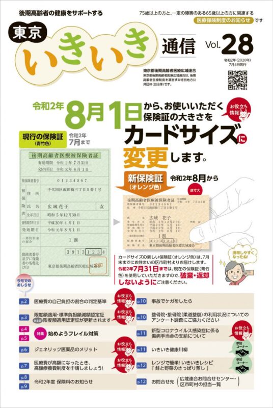 東京都後期高齢者医療広域連合様の広報紙「東京いきいき通信」を制作しています。後期高齢者医療制度の理解を深めていただくための広報誌です。複雑な医療制度を分かりやすく伝えるため、イラストや図版を多用し、情報を視覚的に表現する工夫をしています。特集では、読者の健康づくりに役立つ読み物のほか、読者参加型企画「いきいき健康川柳」や、「レンジで簡単!いきいきレシピ」を掲載しています。