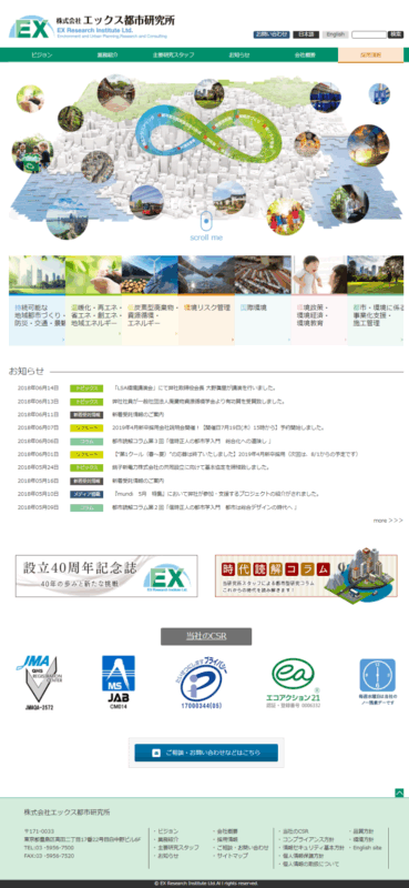 ホームページ クライアント株式会社エックス都市研究所様会社案内(紙版)のリニューアルと合わせて、ホームページリニューアルも担当させていただきました。 下記URLよりホームページをご覧いただけます。 https://www.exri.co.jp/タグ#ホームページ#商社・小売業・サービス業ホームページ制作・システム開発の事例一覧へ