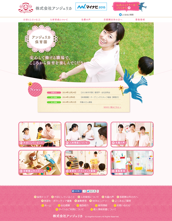 株式会社アンジェリカ様の『保育士採用ページ』のリニューアルを担当いたしました。事業内容を明るく、分かりやすく伝えたいというご希望をもとに、デザイン・コンテンツを一新いたしました。デザインでは、アンジェリカ様のコーポレートカラーであるピンクを基調に、対象となる若い女性をターゲットにした明るく、可愛らしいデザインを心がけました。また、首都圏以外の方からの応募も増やしたいというご要望をもとに、ターゲットに向けたコンテンツも用意しています。